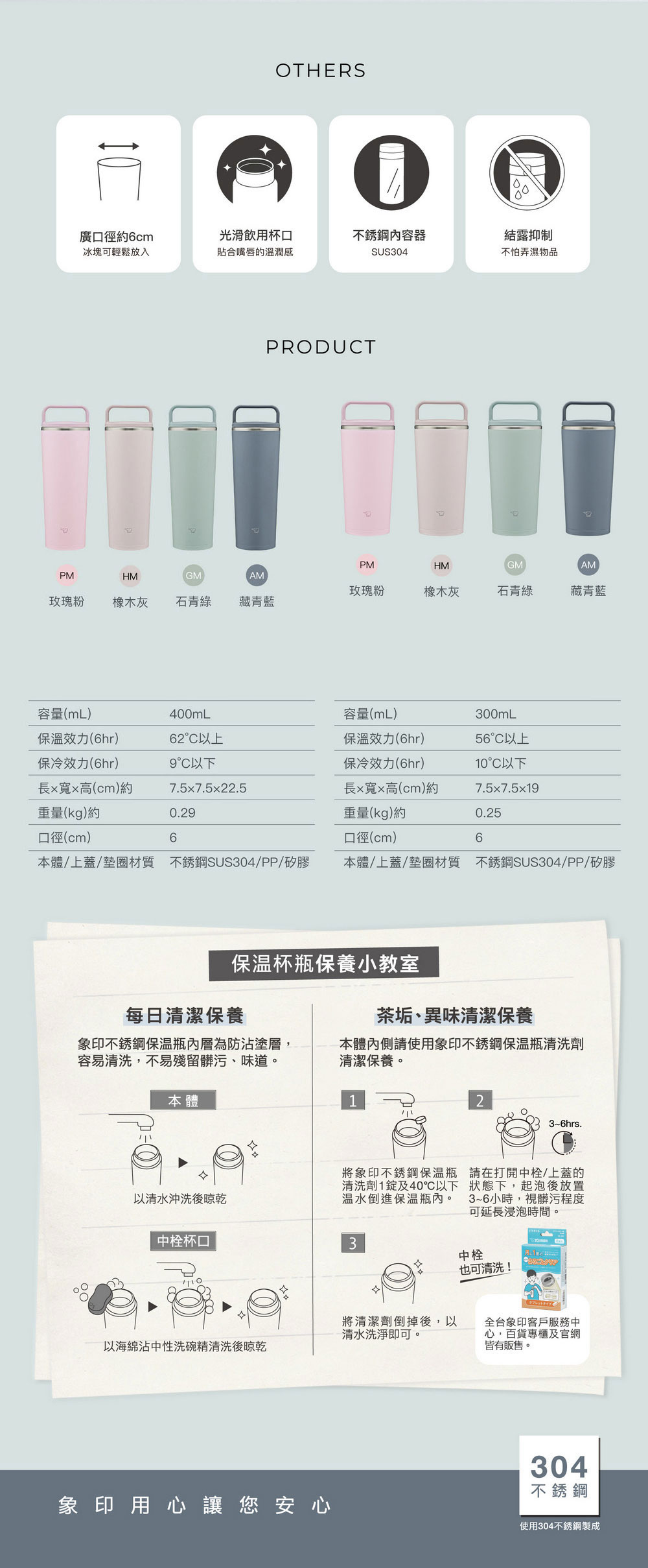 - 象印不銹鋼保溫瓶內層為防沾塗層容易清洗。本體:以清水沖洗後晾乾,中栓杯口:以海綿沾中性洗碗精清洗後晾乾。