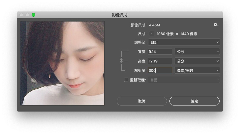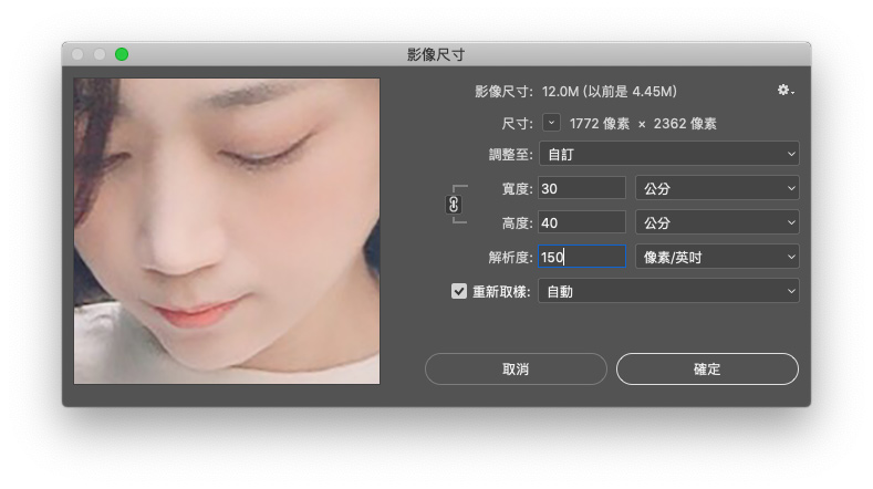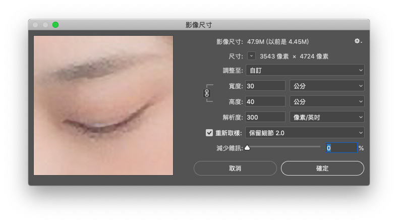 然後就可以在影像尺寸中看到重新取樣裡面有保留細節2.0的設定