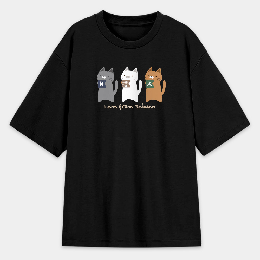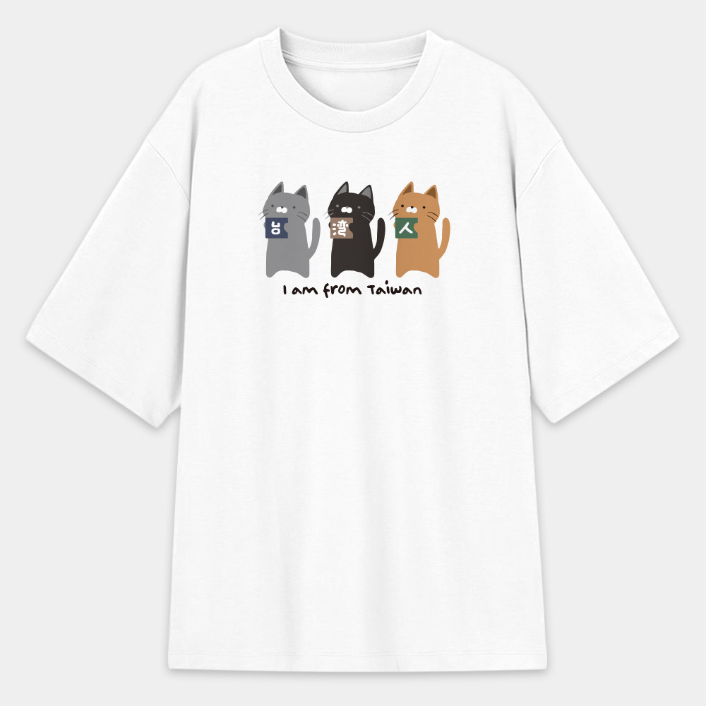 這款 T-shirt 將台灣人的身份認同與超萌的貓咪完美結合!圖案設計精巧,由三隻不同花色的可愛貓咪——個性灰、經典黑與活潑橘,分別抱著印有「台」、「灣」、「人」三個漢字的色塊,展現出台灣人團結又親切的精神。 底部的 "I am from Taiwan" 採用了富有溫度的手寫感字體,整體風格不僅清新自然,更帶有一種溫暖的插畫質感。對於喜歡貓咪、熱愛台灣,或是準備出國旅遊、交流的朋友來說,這不僅是一件衣服,更是最溫馨的自我介紹。