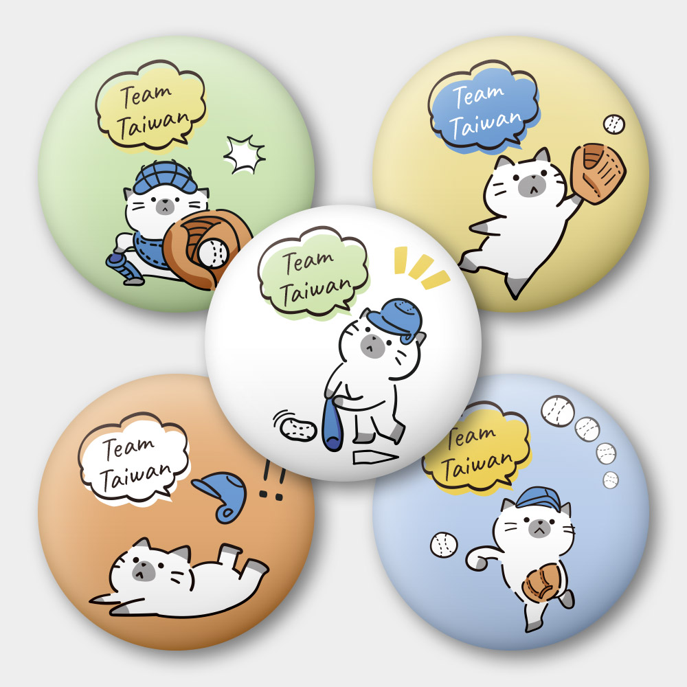 貓咪棒球 58mm 胸章 磁鐵 鑰匙圈 5 件套組