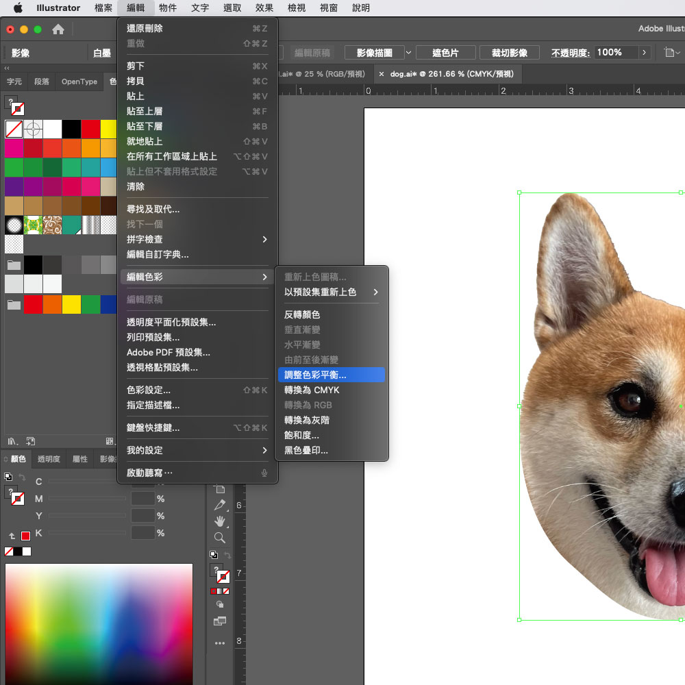 先把去背後的 PNG 圖片嵌入 Illustrator 中,使用編輯 > 編輯色彩 > 調整色彩平衡