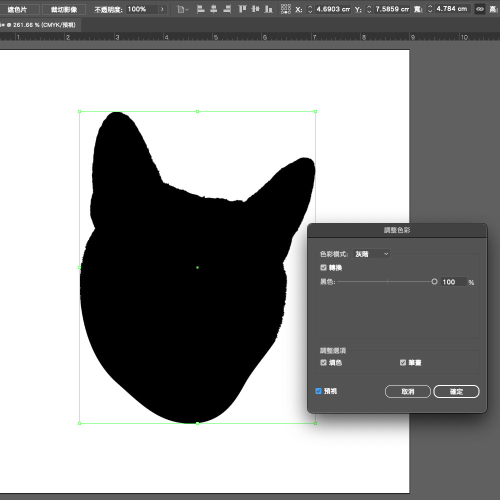 將色彩模式改為灰階,轉換設定為100%,這樣就可以把圖片變成黑色