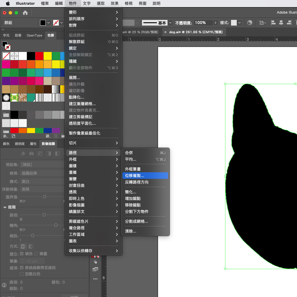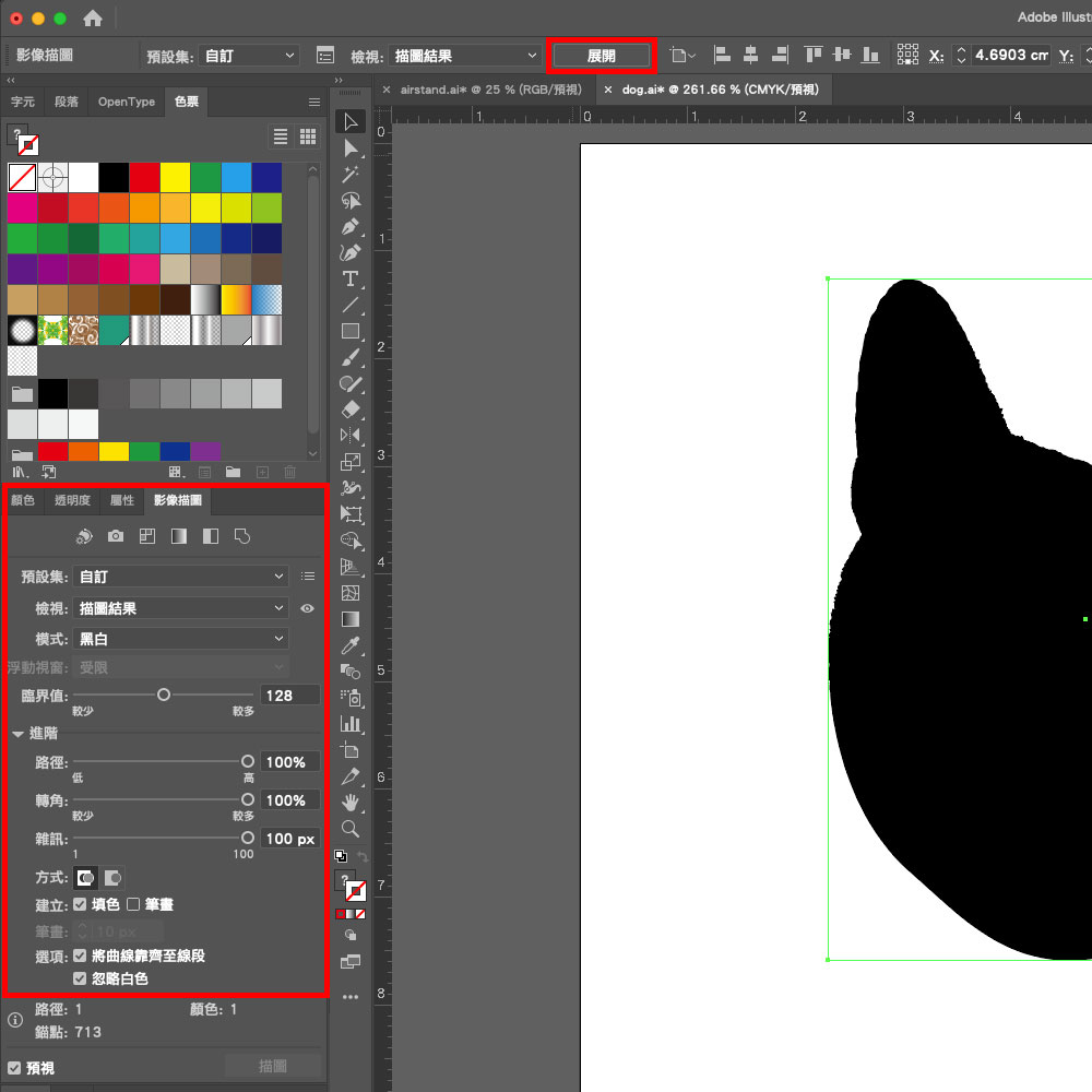 開啟影像描圖面板,將路徑設定100%,轉角100%,雜訊100px,勾選忽略白色,在上方的工具列展開,就可以將影像轉為向量,用來做為印刷白墨的色版