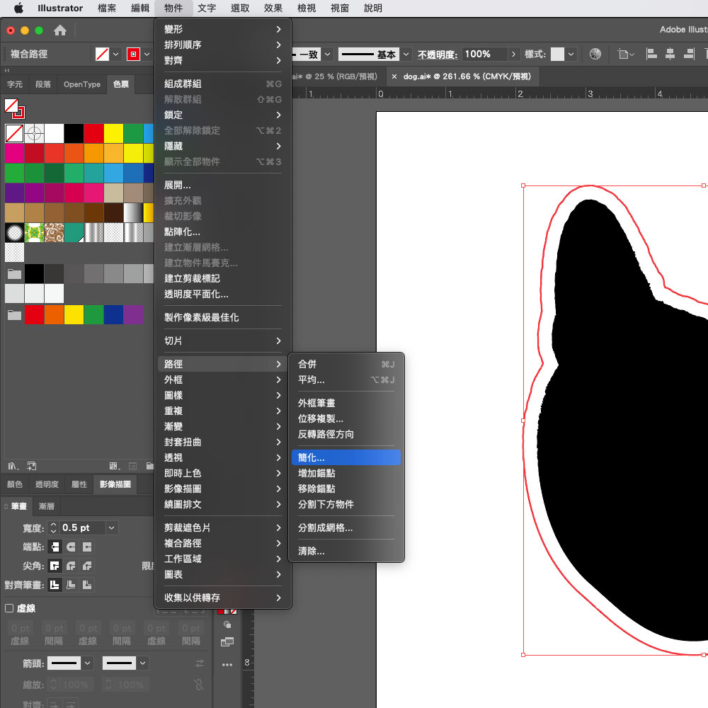 然後將外擴的刀模線設定為紅色,並拖移到上方的刀模圖層,然後開啟物件 > 路徑 > 簡化
