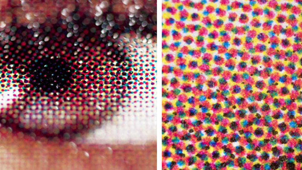 透過放大鏡可以看出印刷是由CMYK四種大小不同的網點組合而成