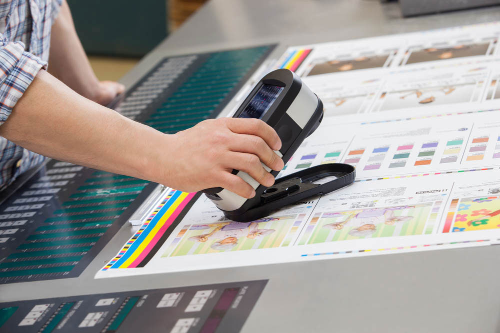 那麼數位印刷是怎麼校色呢?首先EPSON這類的大圖輸出機,原廠在交機時一定會先印出CMYK色塊出來校正,透過色差儀去比對顏色的光譜是否正確,若有色差就透過曲線調整墨量,最後在做成校色檔,不同的印刷物會有不同的校色檔,布、道林紙、雪銅紙、銅板紙的顯色都不一樣,每次輸出時就用這些校色檔來維持一致的色彩,因此這個校色是針對電腦中的CMYK參數去比對是否一致,而不是去比對螢幕的RGB,請務必記得在螢幕上所看到的CMYK都是用RGB模擬的。