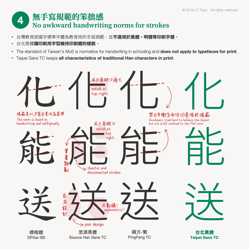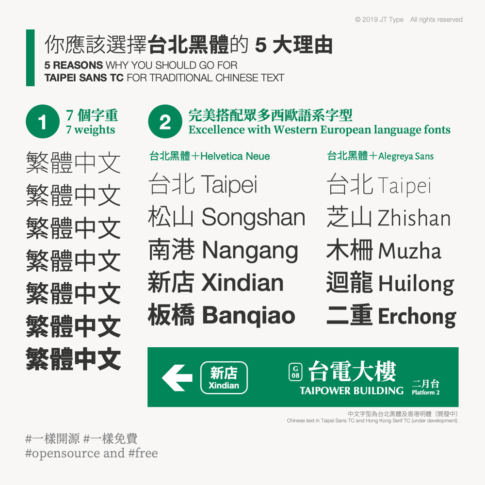大部分的設計師都知道商用字體要付費才能合法使用,但一般人可能不一定知道,直到有Youtuber自稱收到字體公司的存證信函才發現事情大條了,畢竟一套中文字體有一萬三千多個字,是一個很龐大的設計工程,有些商用版的一套要上萬元,算起來一個字也才一元,甚至更低,不過對大部分不是以設計為業的人,偶爾使用是一筆相當大的負擔,但是電腦內附的字體永遠都是醜醜的新細明和楷體,怎麼辦呢?以下介紹一套由翰字鑄造 JT Foundry所設計的台北黑體